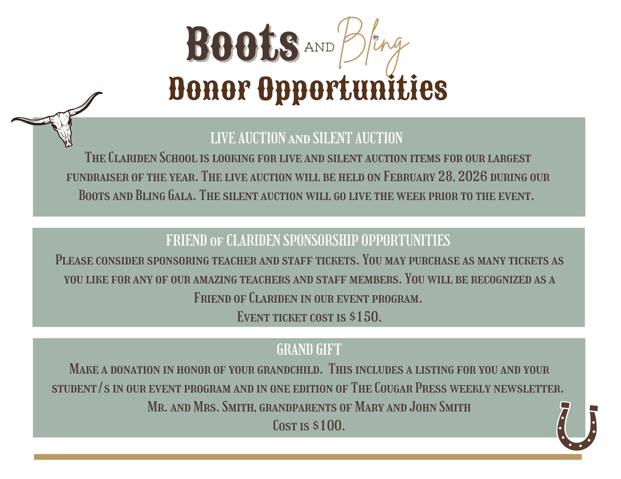 The Clariden School comes together to celebrate our community by raising unrestricted funds that directly meet and expand the student and staff experience on campus. One way to support Clariden is by becoming a 2026 Gala Sponsor. The sponsor package makes it worthwhile for both our immediate Clariden community and our friends and business partners in the DFW area. Please consider supporting Clariden so we can continue to offer an unparalleled learning environment that